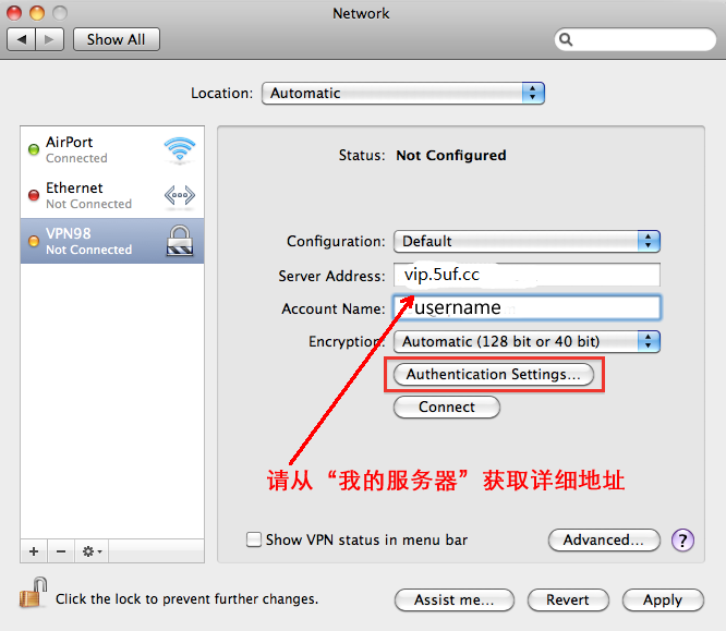 本站已经针对mac提供了自动配置的文件,详情可以点击http://www.we5uf.info/news/vpn/id/74/这里查看。