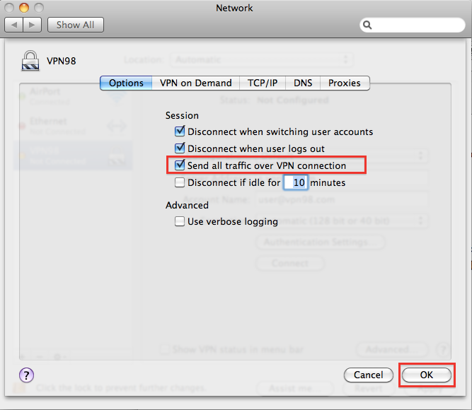 第七步:点击“高级”按钮,对VPN的使用方式进行设置,选中“使用VPN连接发送所有流量”,然后点击“确定”。