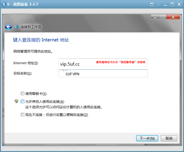 第六步:”Internet地址“栏填写”vip.5uf.cc“,在服务器栏中填入“vip.5uf.cc(服务器地址可以在"我的服务器"获得)”目标名称“填写”无忧府VPN“,点击下一步